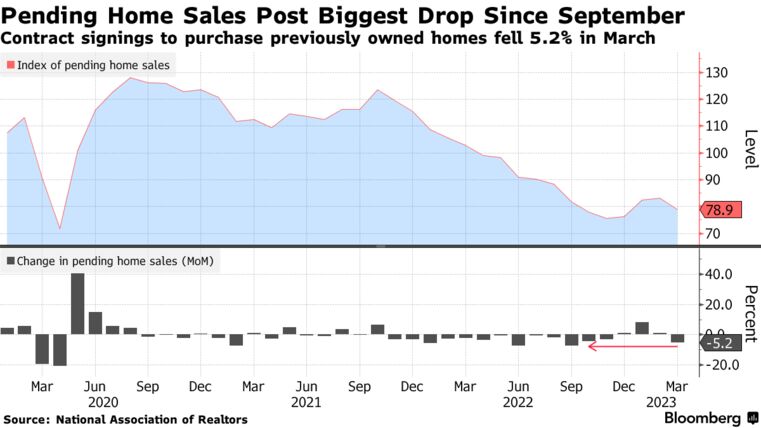 The National Association of Realtors’ index of contract signings to purchase previously owned homes dropped 5.2% in March to 78.9, according to data released Thursday. The decrease was worse than all estimates in a Bloomberg survey of economists, which called for a 0.8% advance.