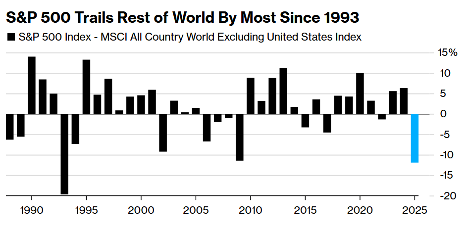 That, however, doesn’t mean US stocks are actually doing well compared to the rest of the world. The S&P 500 is trailing the MSCI All Country World Index excluding the US Index by almost 12 percentage points in 2025, marking the worst start to a year against its global peers since 1993 and its second-worst ever, data compiled by Bloomberg show.