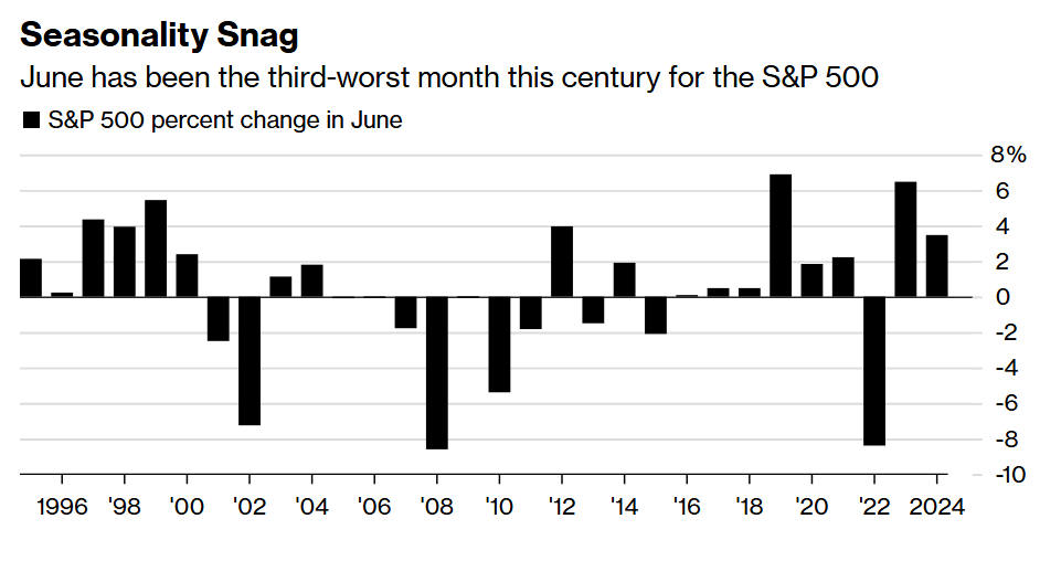 The S&P 500 has risen just 0.2% on average in June over the past three decades, compared with a 0.8% move in the other 11 months of the year, according to data compiled by Bloomberg. In post-US presidential election years over the past seven decades, the S&P 500 has typically struggled in early June as investors booked profits heading into the summer. This is particularly true if the index gets a strong boost in May, like it did this year with a 6.2% jump.