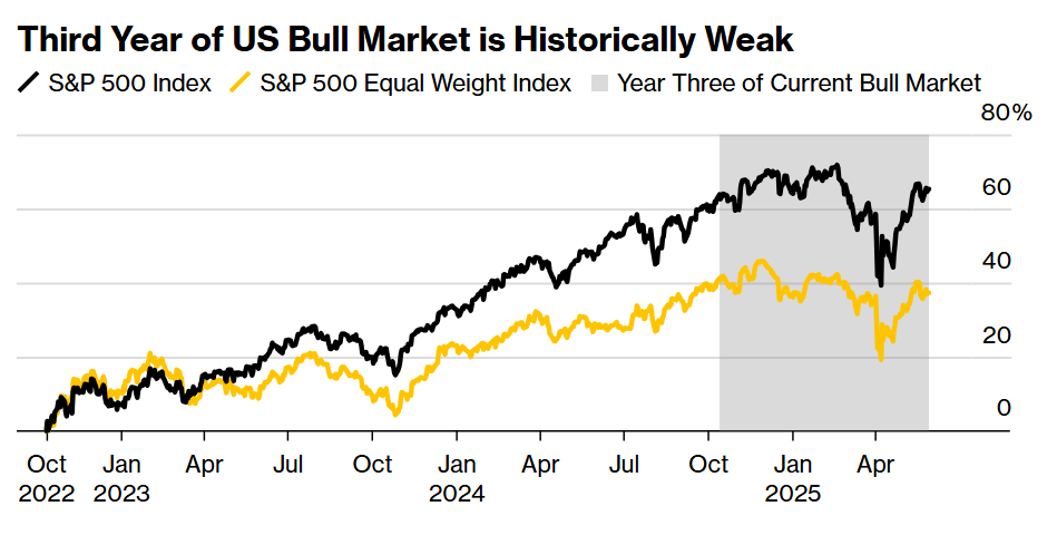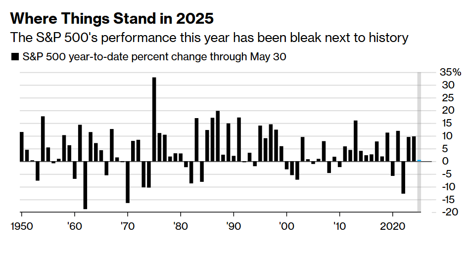 Coming off the best month for the S&P 500 Index in a year and a half and the best May since 1990, the benchmark is still basically flat for 2025 and putting up one of its worst starts to a year since the 1950s. In a rare switch, it’s also getting handily beaten by stock markets around the world.